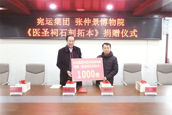 張仲景博物院副院長凌皆兵對胡逸云一行的善舉表示感謝。他說,《醫(yī)圣祠石刻拓本》一書內(nèi)容豐富翔實,充分彰顯了醫(yī)圣祠廊庭內(nèi)歷代石刻的文化價值。宛運集團出資印行此書,不僅展現(xiàn)了公司的社會責(zé)任擔(dān)當(dāng),更展現(xiàn)了胡逸云董事長深厚的文化情懷。